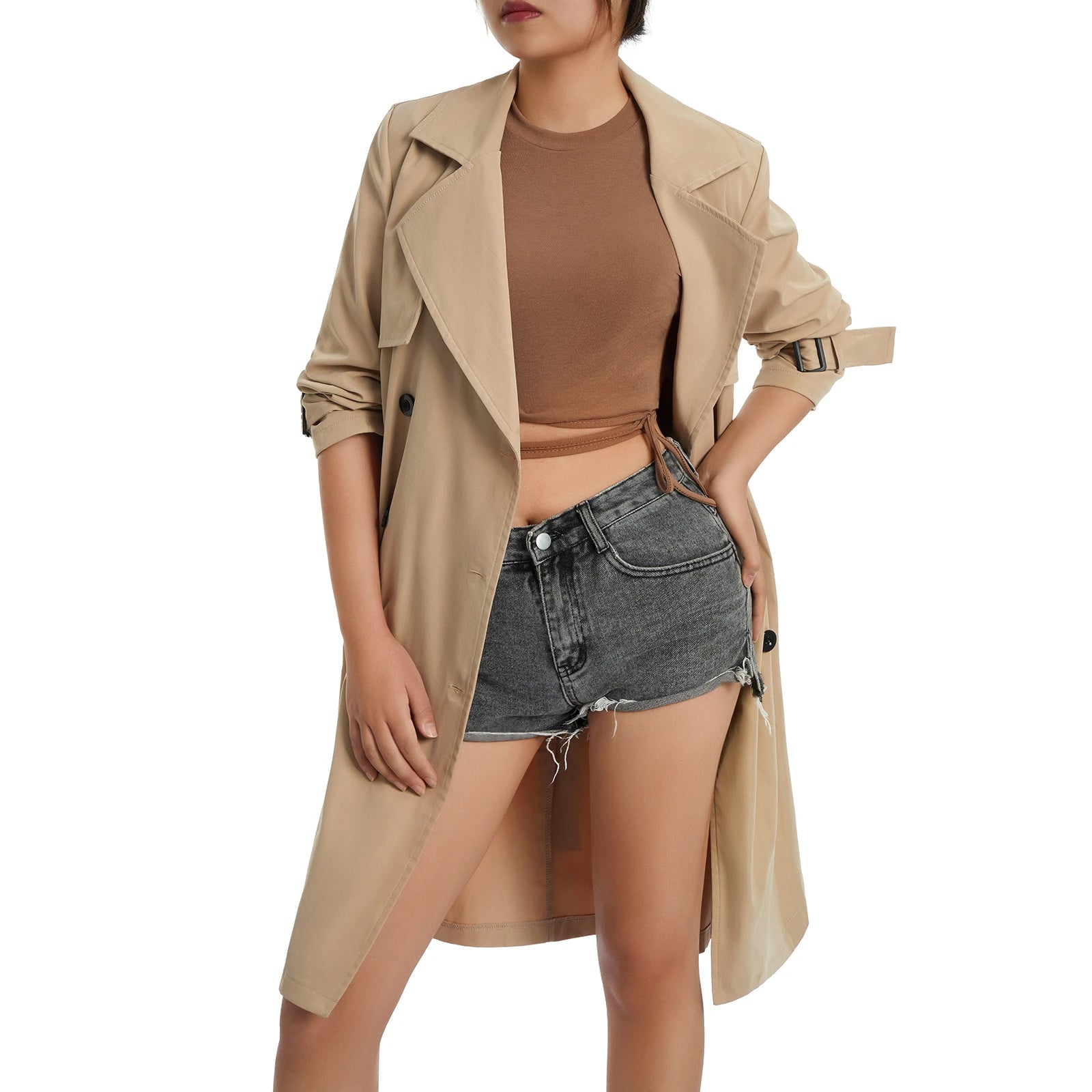 Autumn Fashion Women Casual Solid Color Trench Coat Ladies Elagant Long Sleeve Lapel Neck Double Breasted Belted Trench Coat