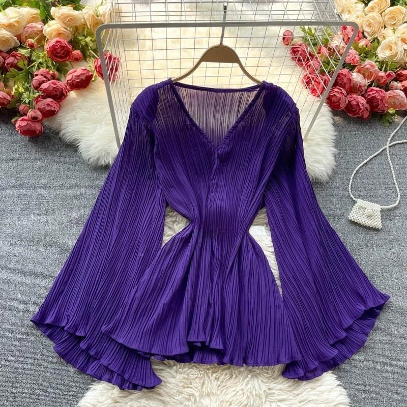 Pullover V~Neck Blouse/Black/White /Women Design Flared Sleeves/Pleated Blouses/Women’s Chic Loose Fitted.