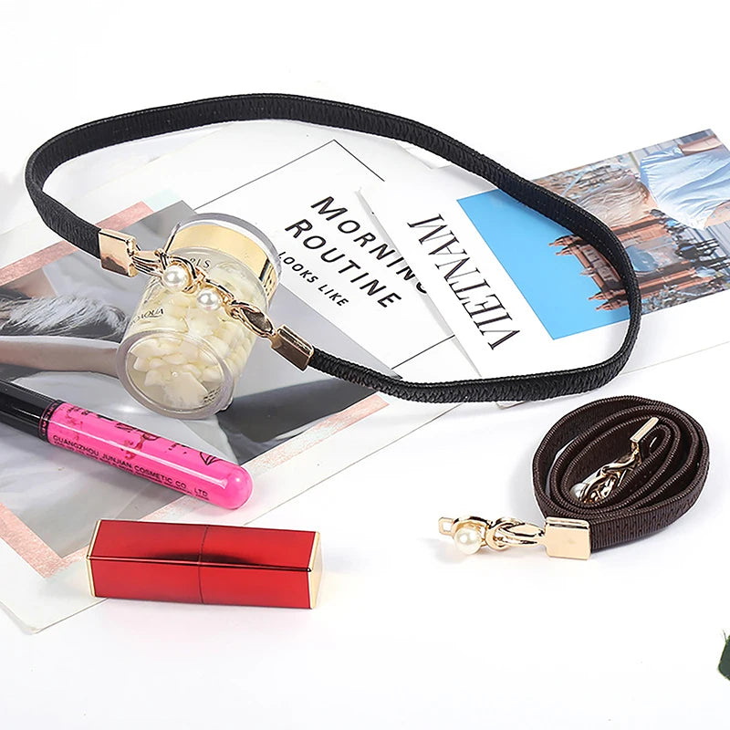 Elegant Double Pearl’s/Elastic Buckle Women Belt’s/Black Thin Straps Lady Girl Dress Skirt Decor Waistbands.