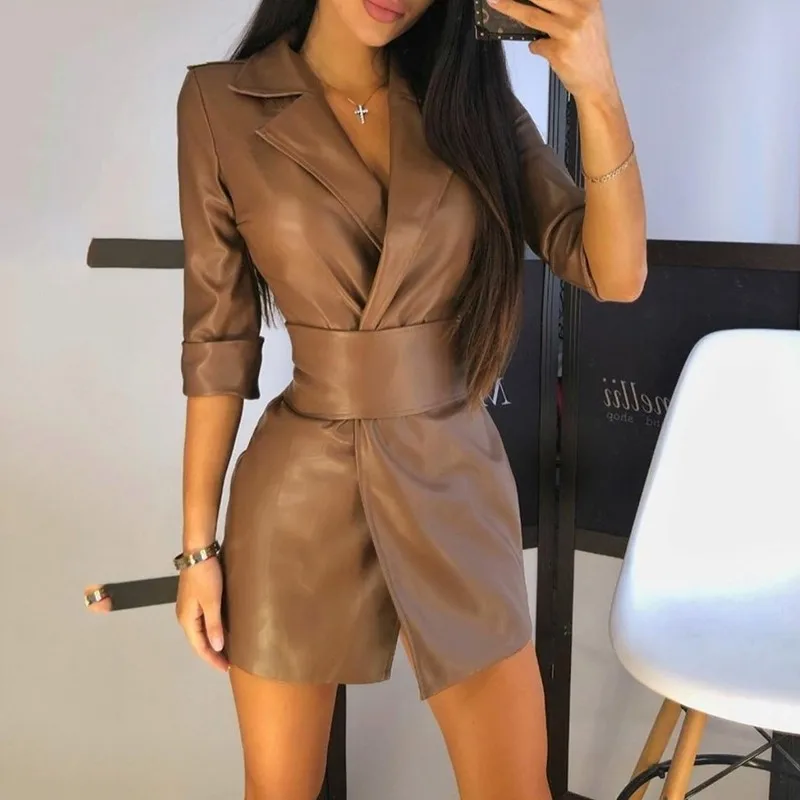 Elegant Leather Body~Con Women's Dress/ V~Neck Leather Mid Length/PU Leather Waist Closure/TrendingTurn Down Dress With Belt.