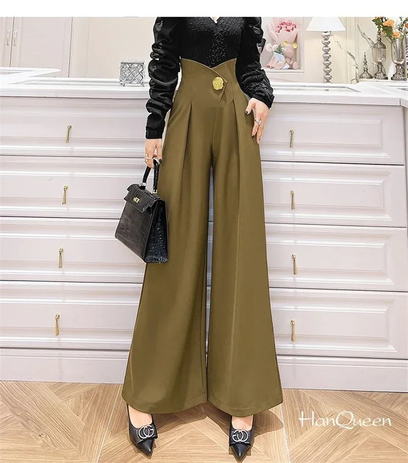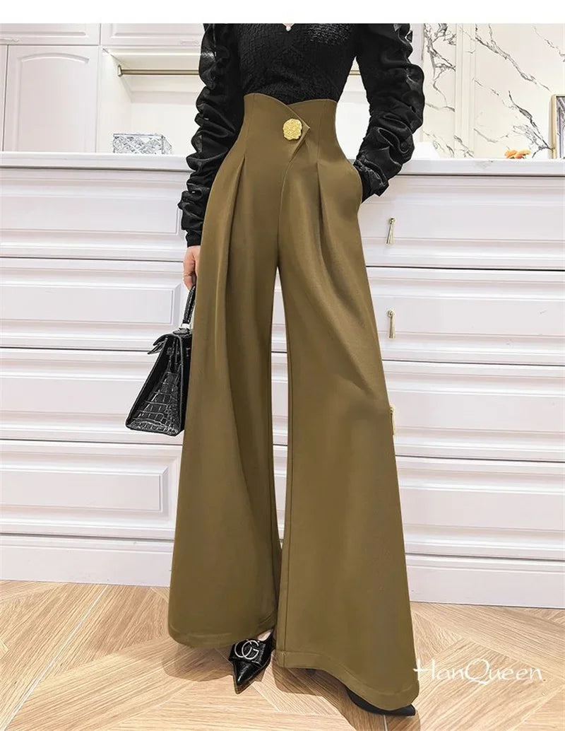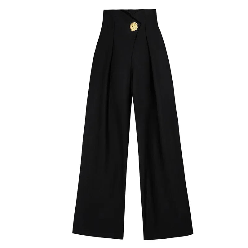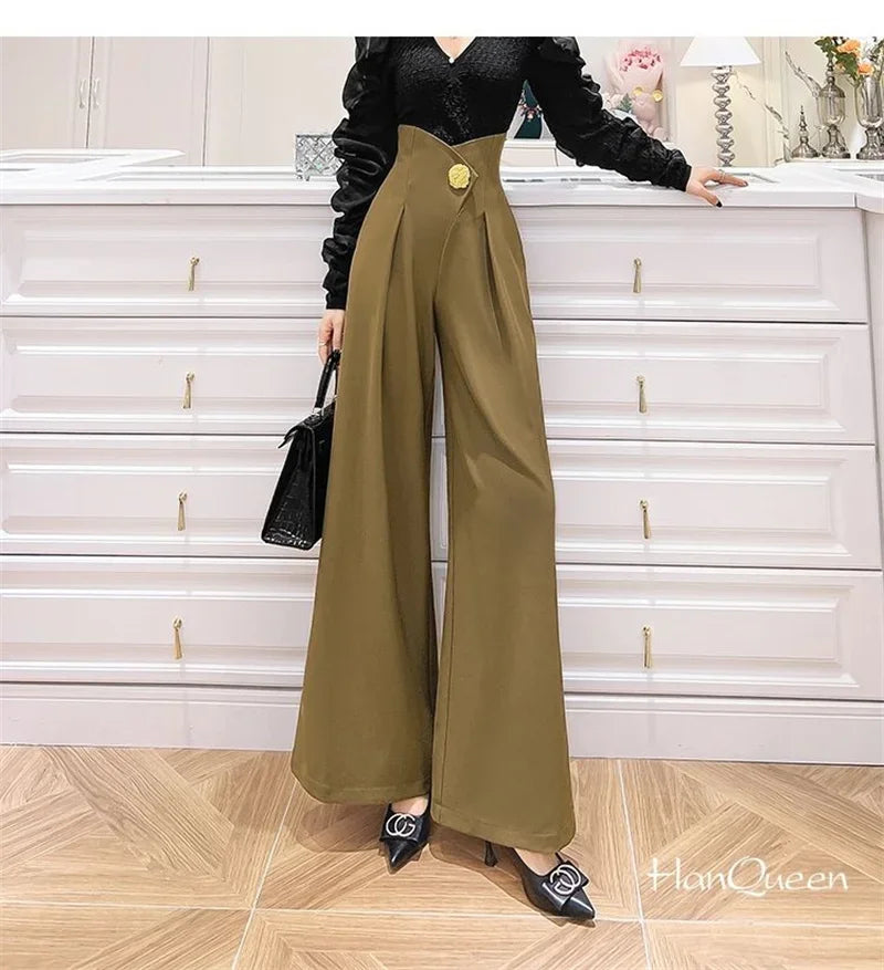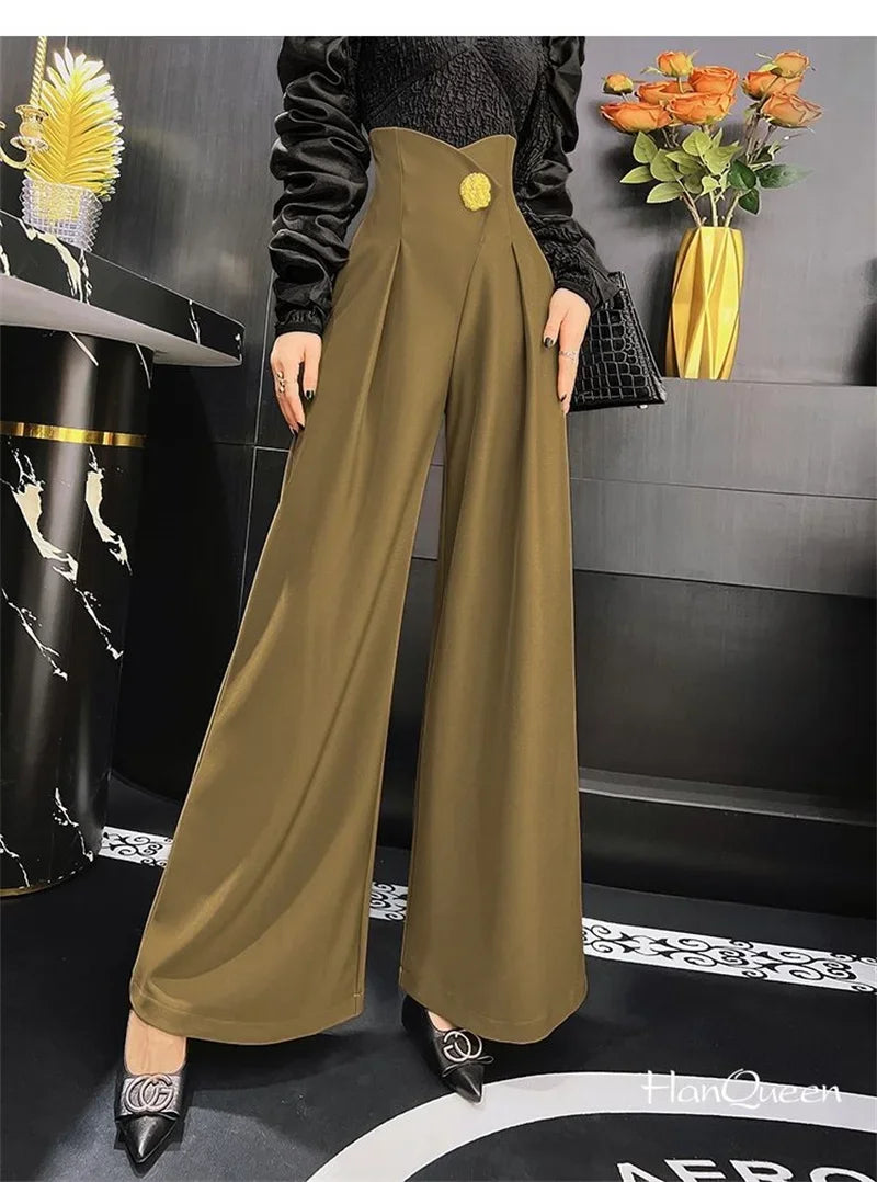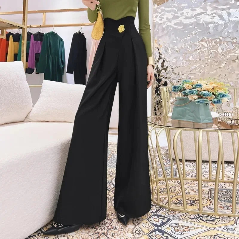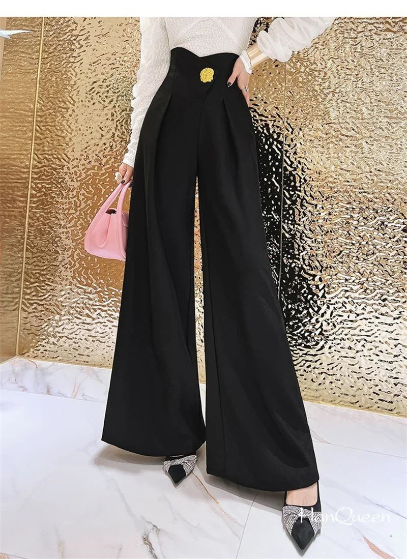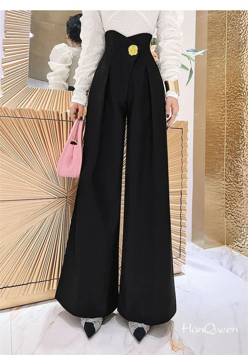 Elegant Office Lady Wide Leg Pants Design Flower Button High Waist Pantalones Baggy Spring Summer Straight Spodnie New