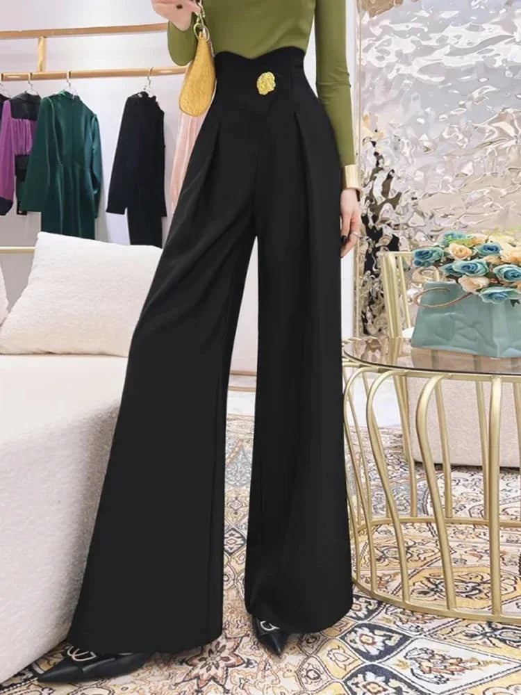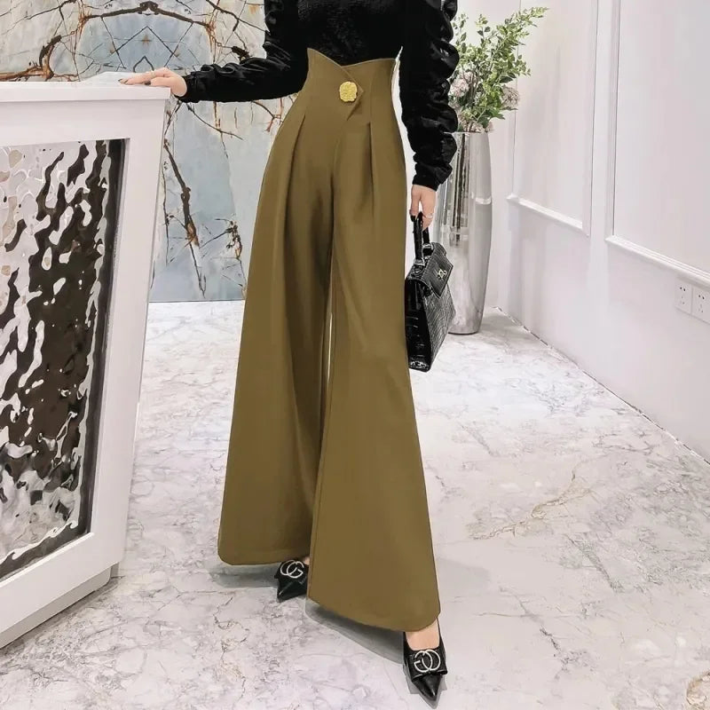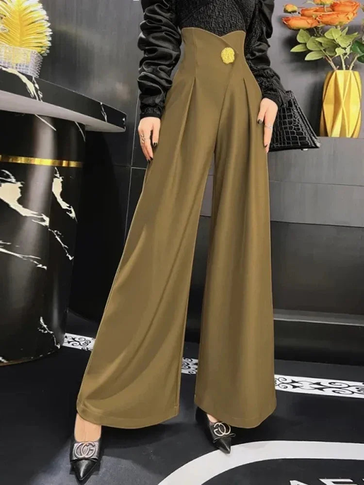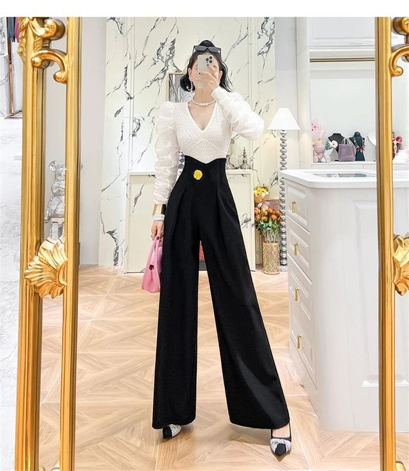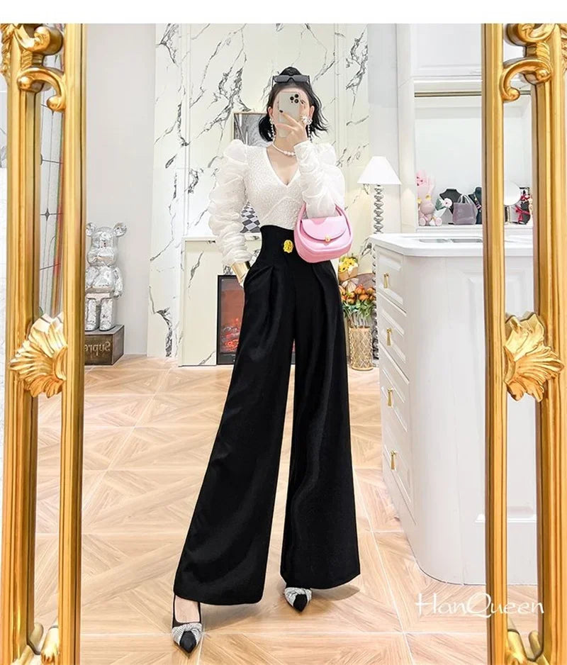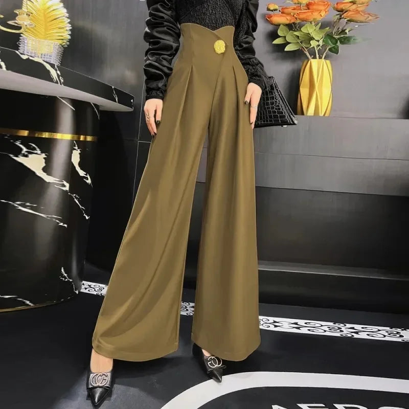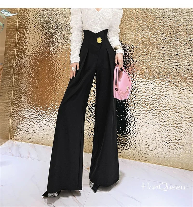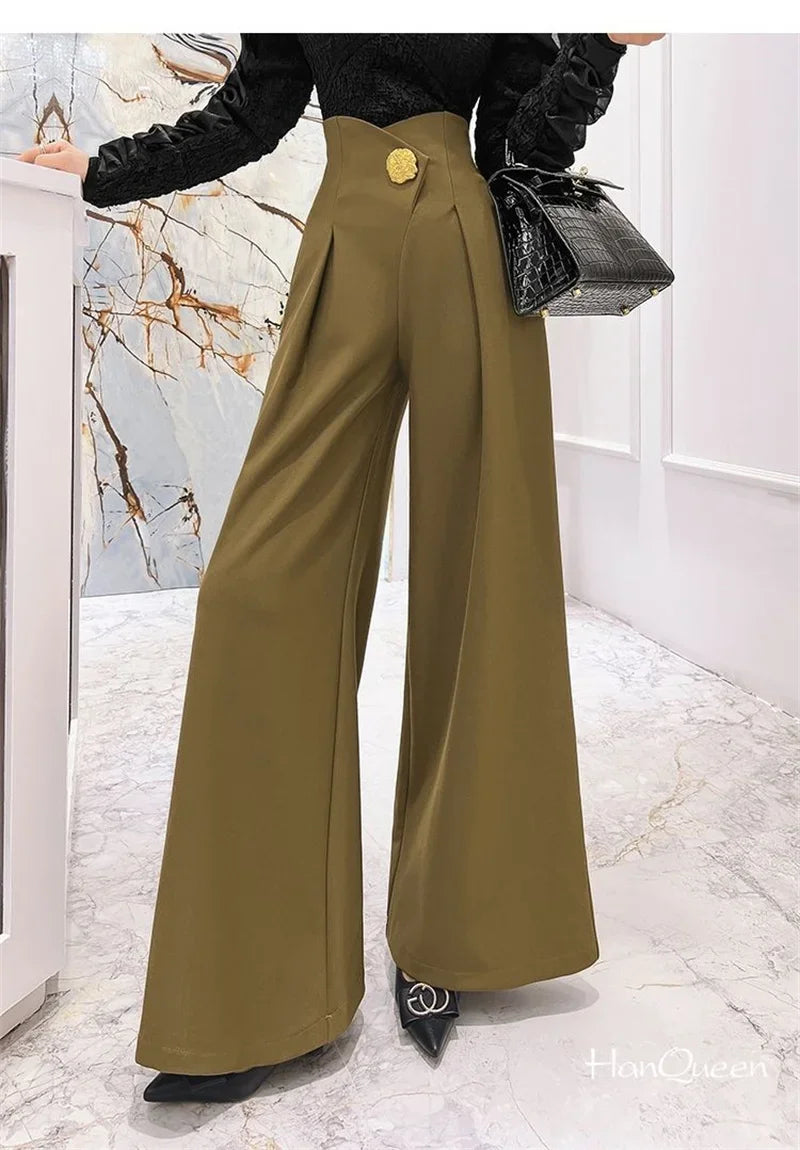 Elegant Office Lady Wide Leg Pants Design Flower Button High Waist Pantalones Baggy Spring Summer Straight Spodnie New