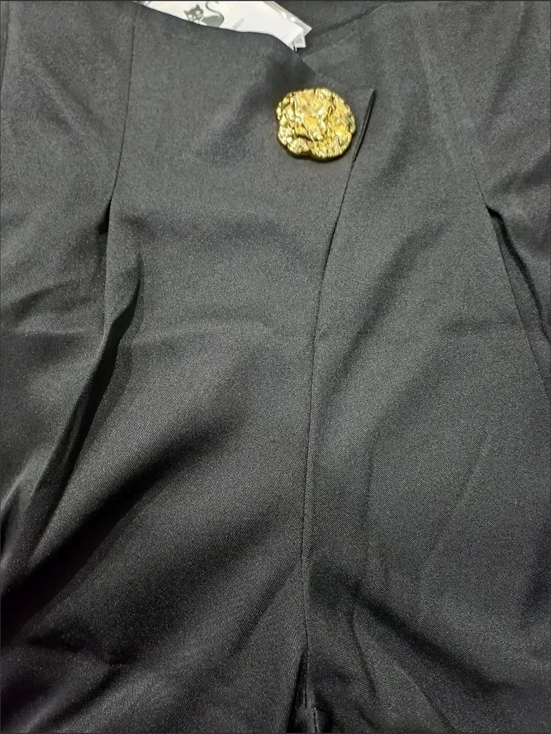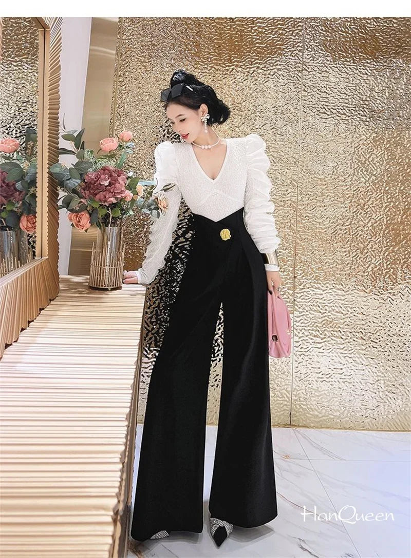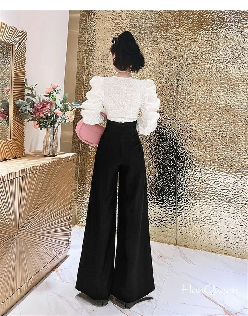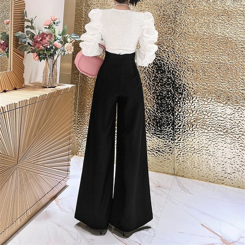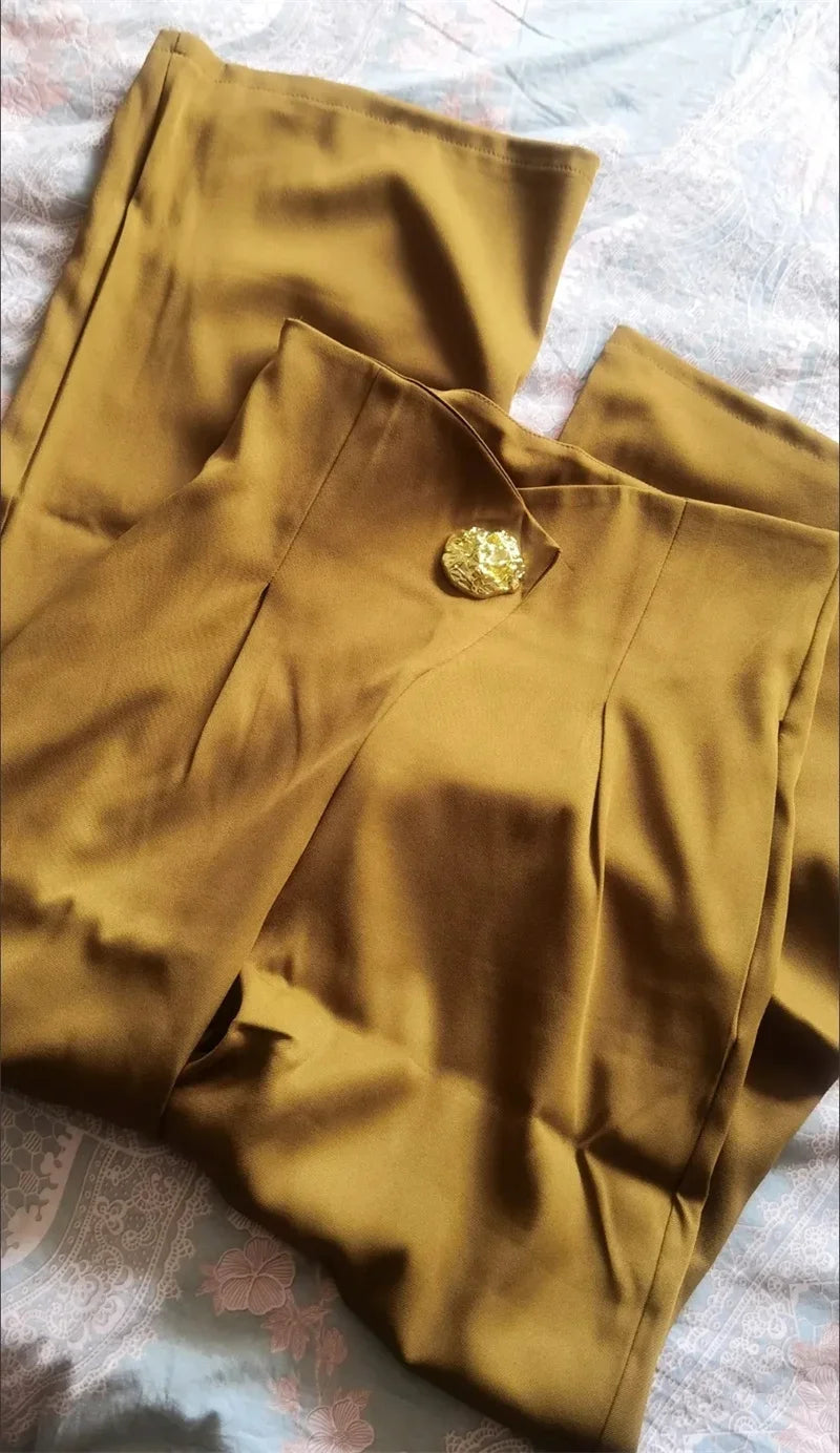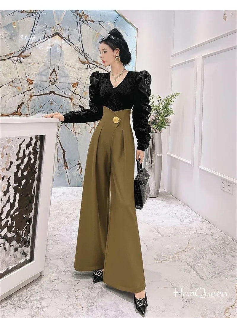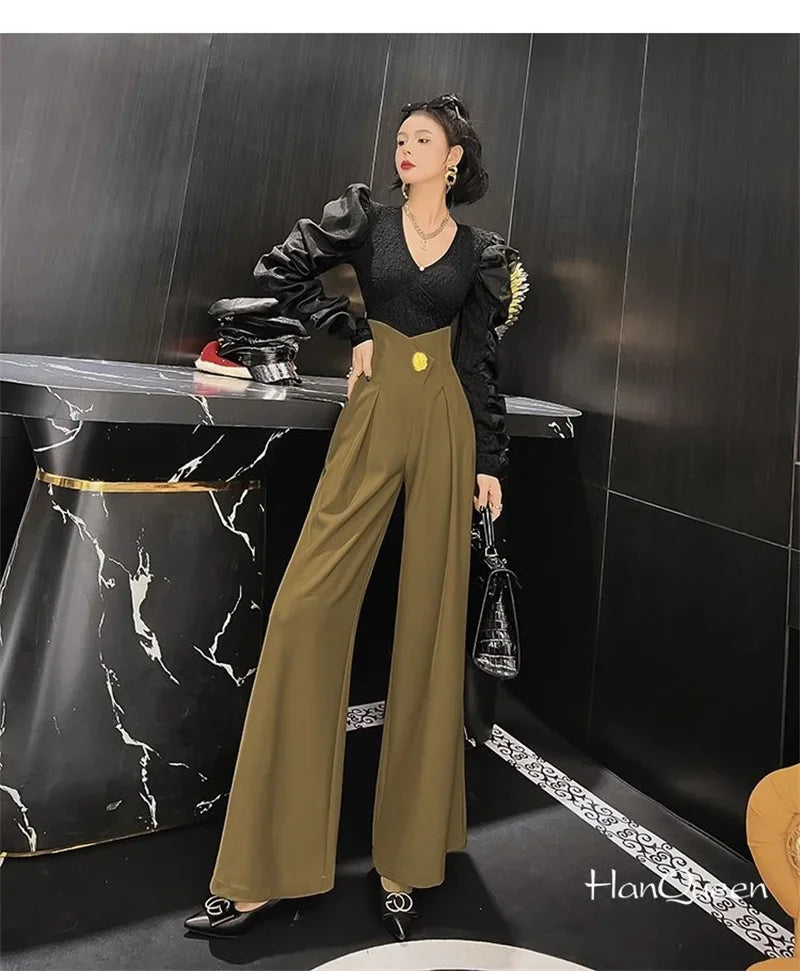 Elegant Office Lady Wide Leg Pants Design Flower Button High Waist Pantalones Baggy Spring Summer Straight Spodnie New