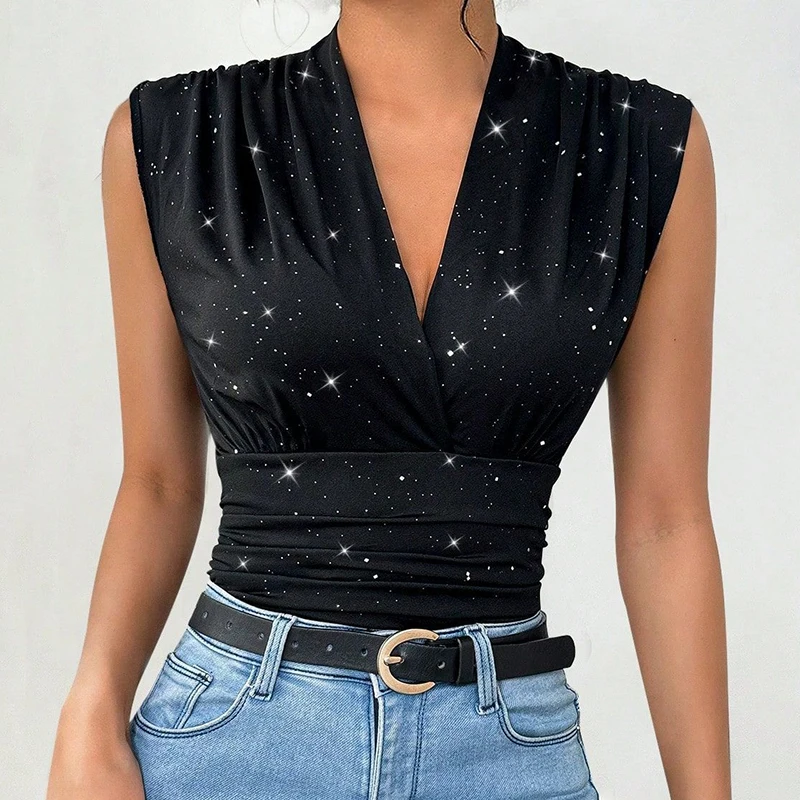 Fashioned Sequined Decor Blouse/New Mesh V~Neck/Folds Sleeveless Tank Top/Streetwear Tight Waist Slim Black Cropped Blouse.