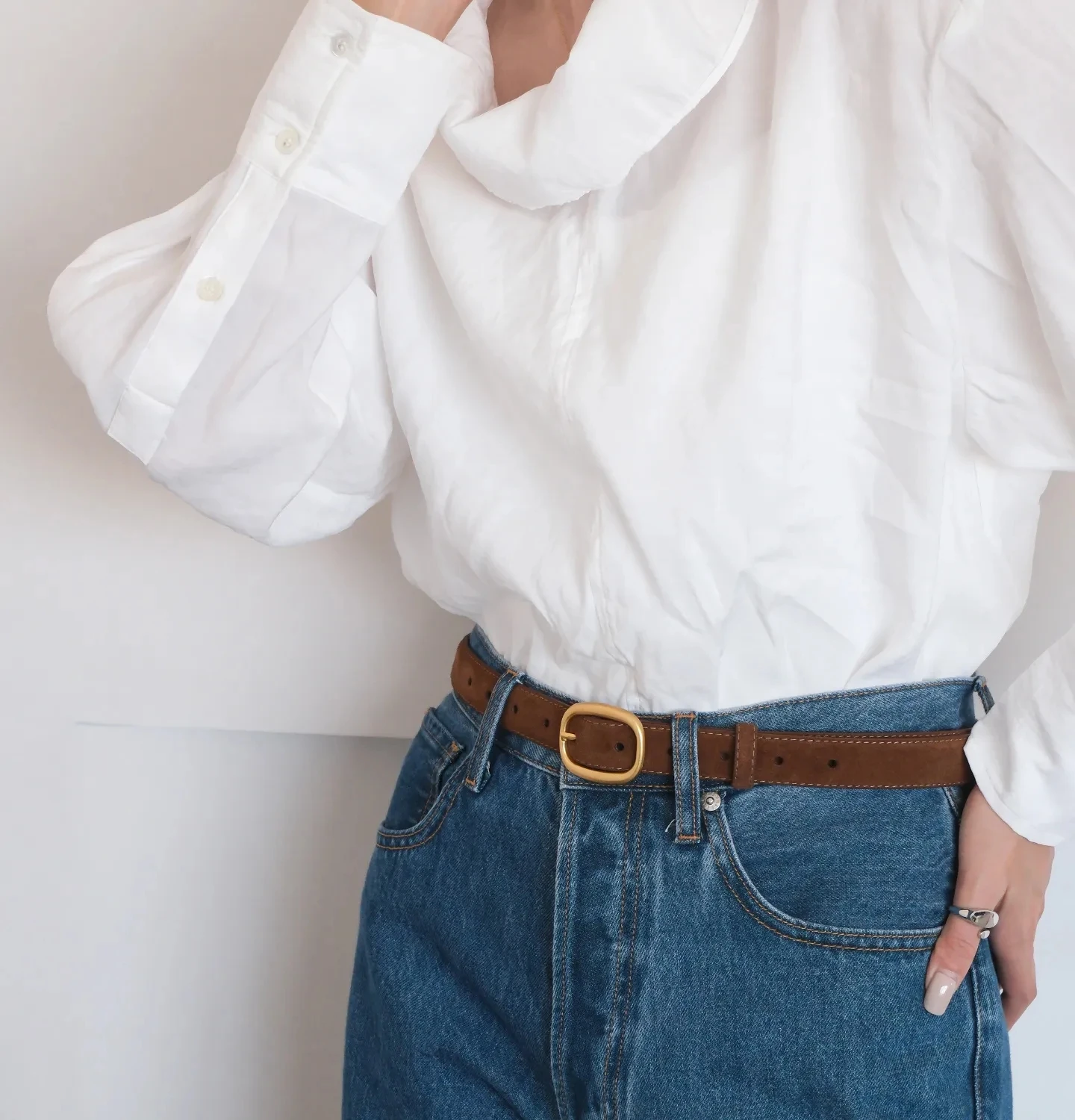 Suede Leather Skinny Fitted Belt/ Slim Waistband/Gold Buckle black Gray Casual Accessory for Jeans Pants & Dresses.