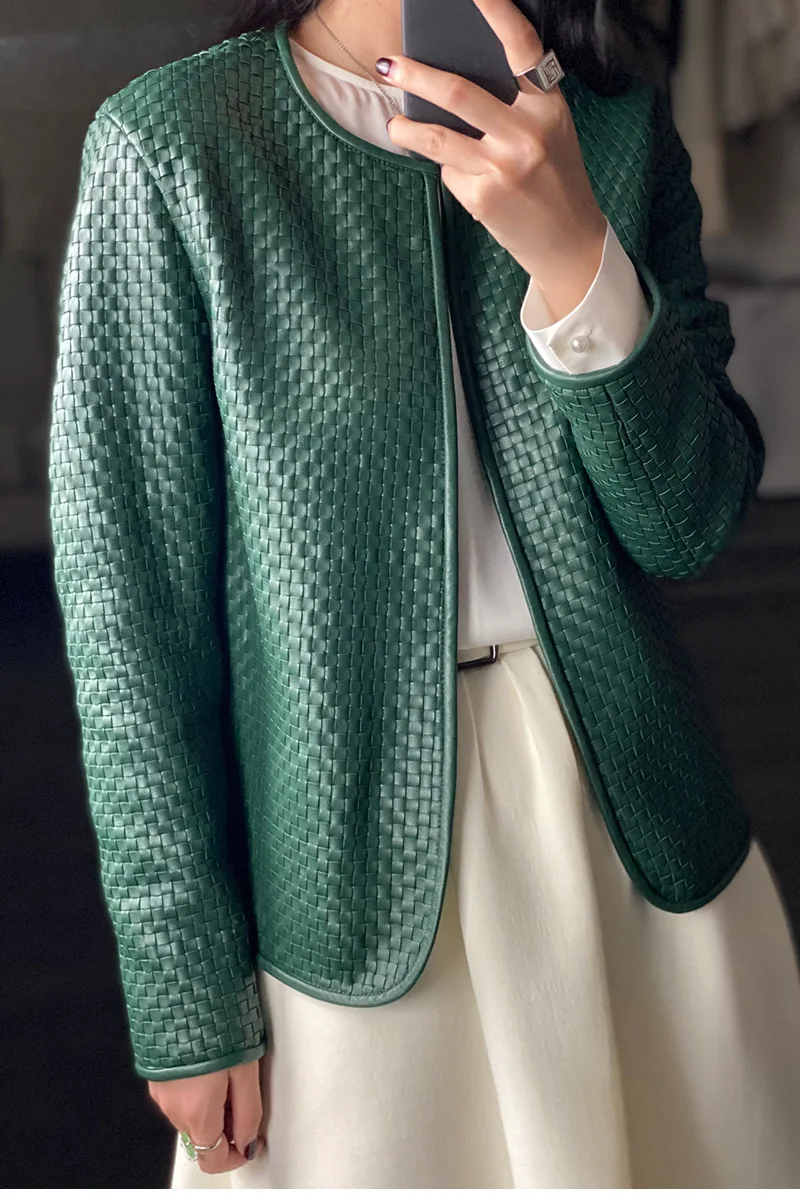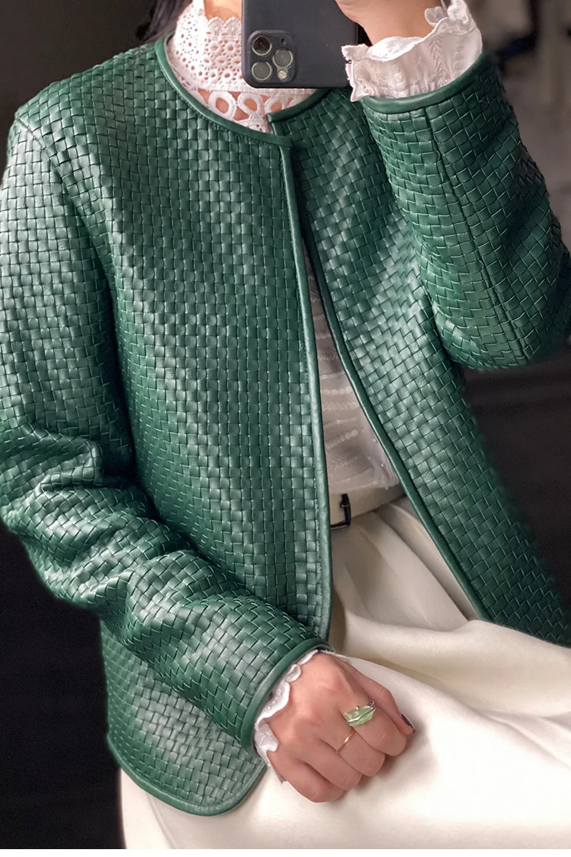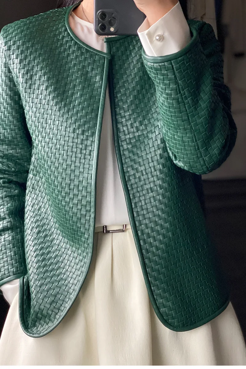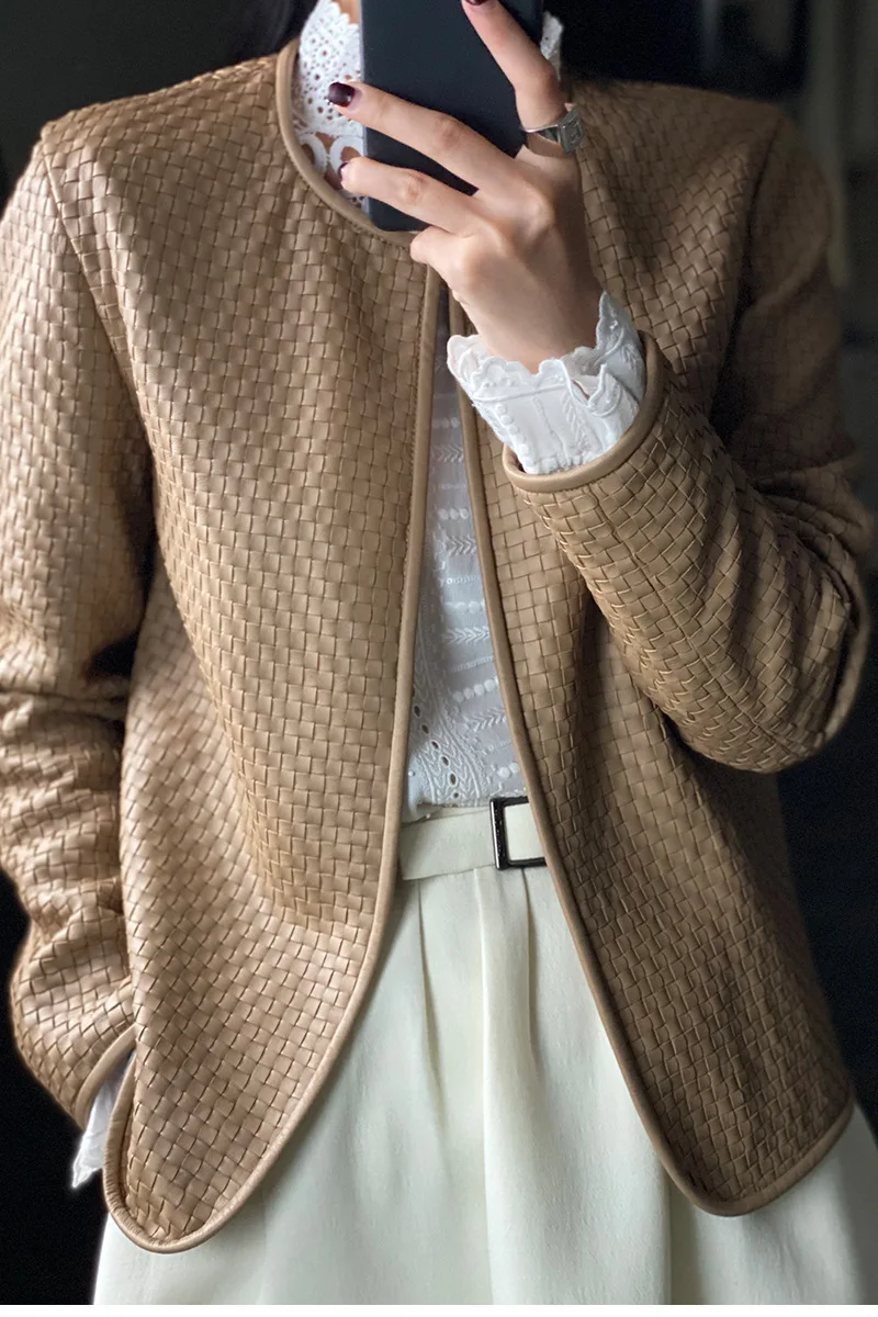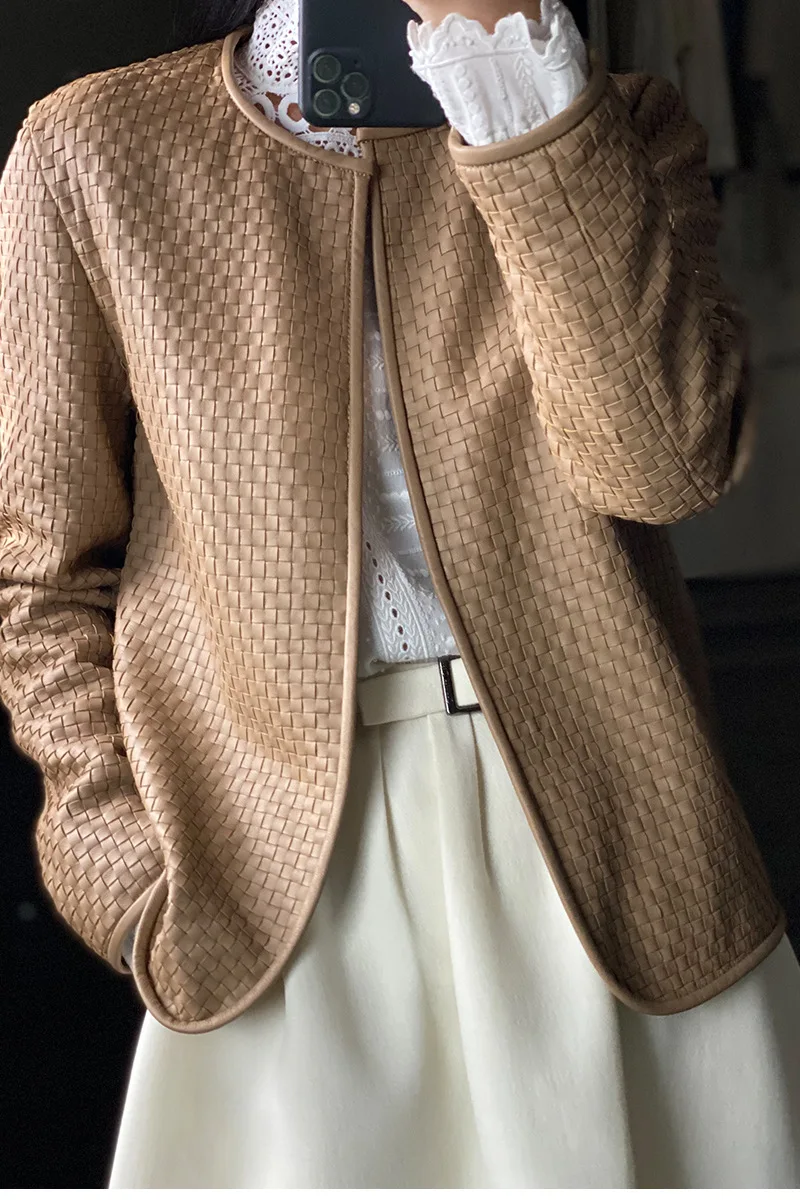 Genuine Leather Jacket/Women Stylish Vintage Jacket/Hand-Woven Sheepskin/O-Neck Cardigan Plaid Coat Outwear.