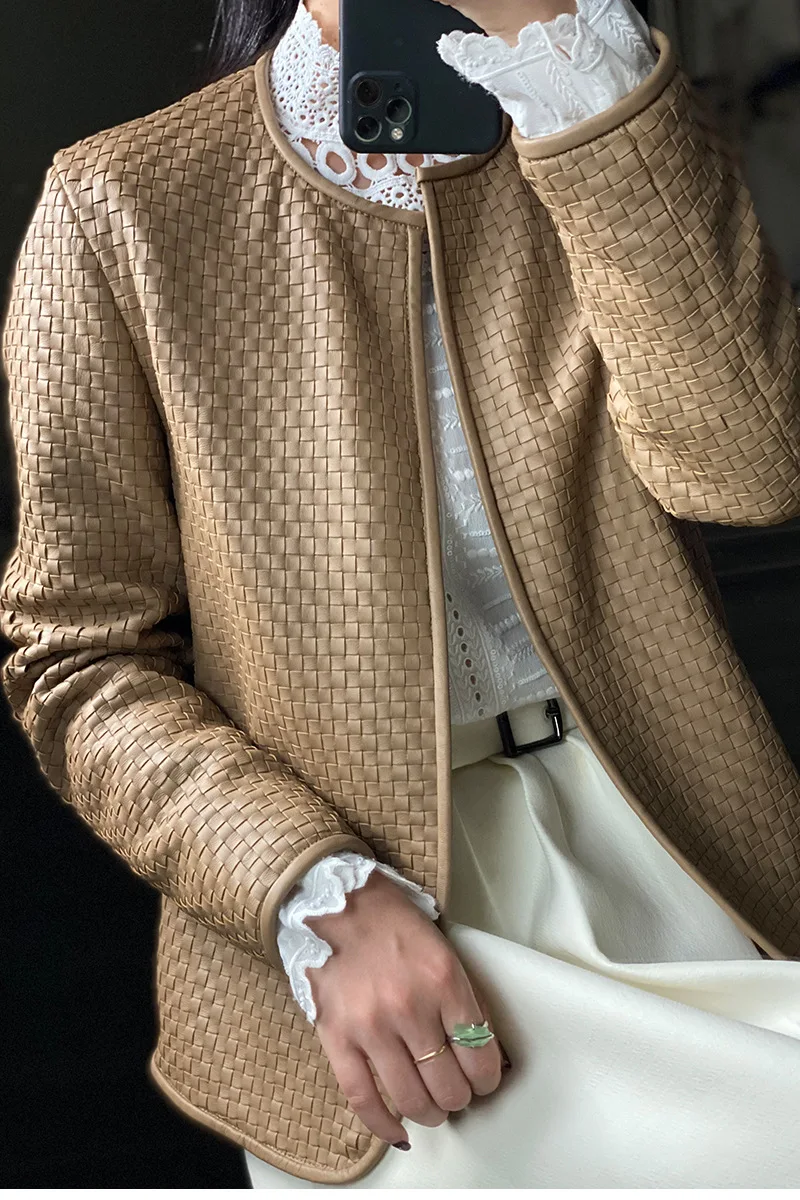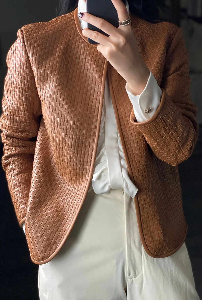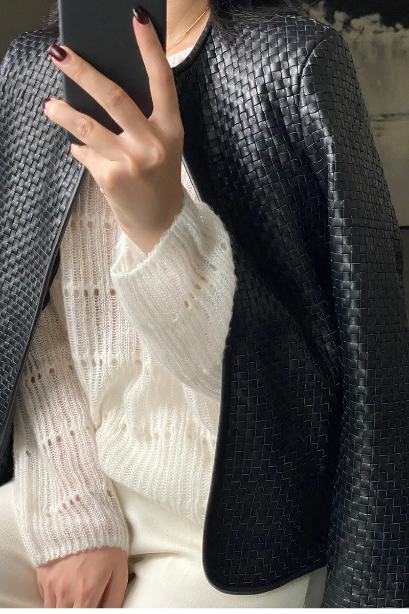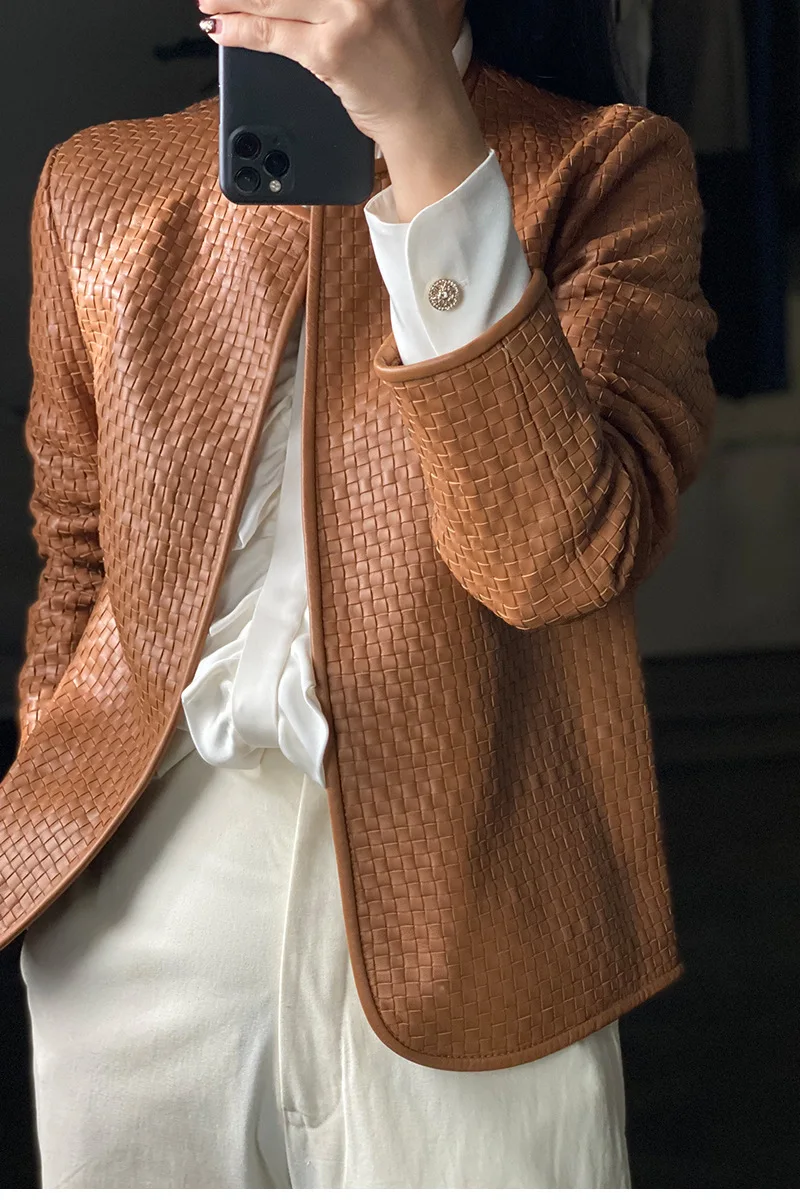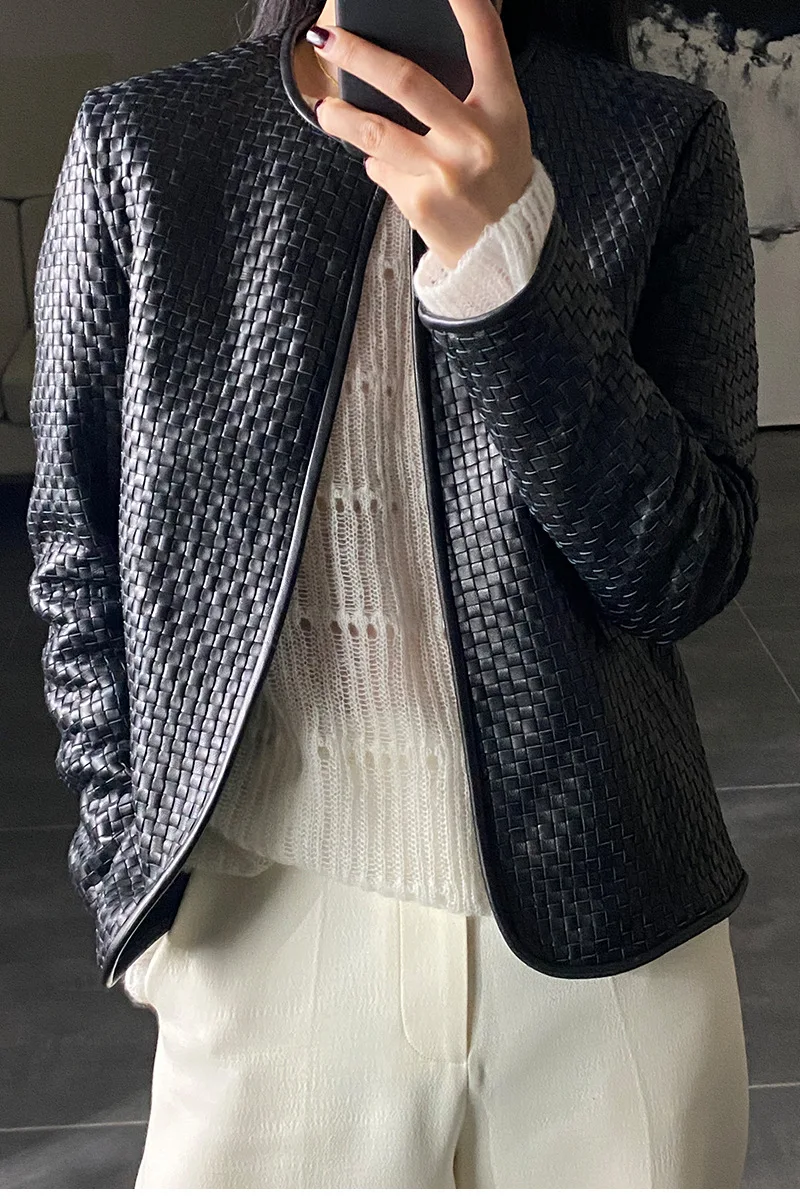 Genuine Leather Jacket/Women Stylish Vintage Jacket/Hand-Woven Sheepskin/O-Neck Cardigan Plaid Coat Outwear.