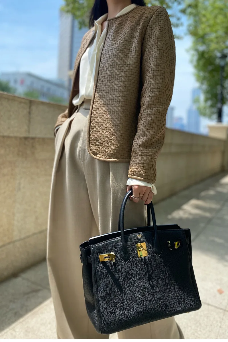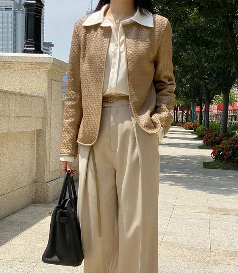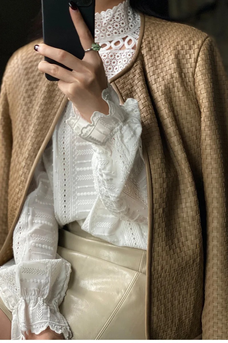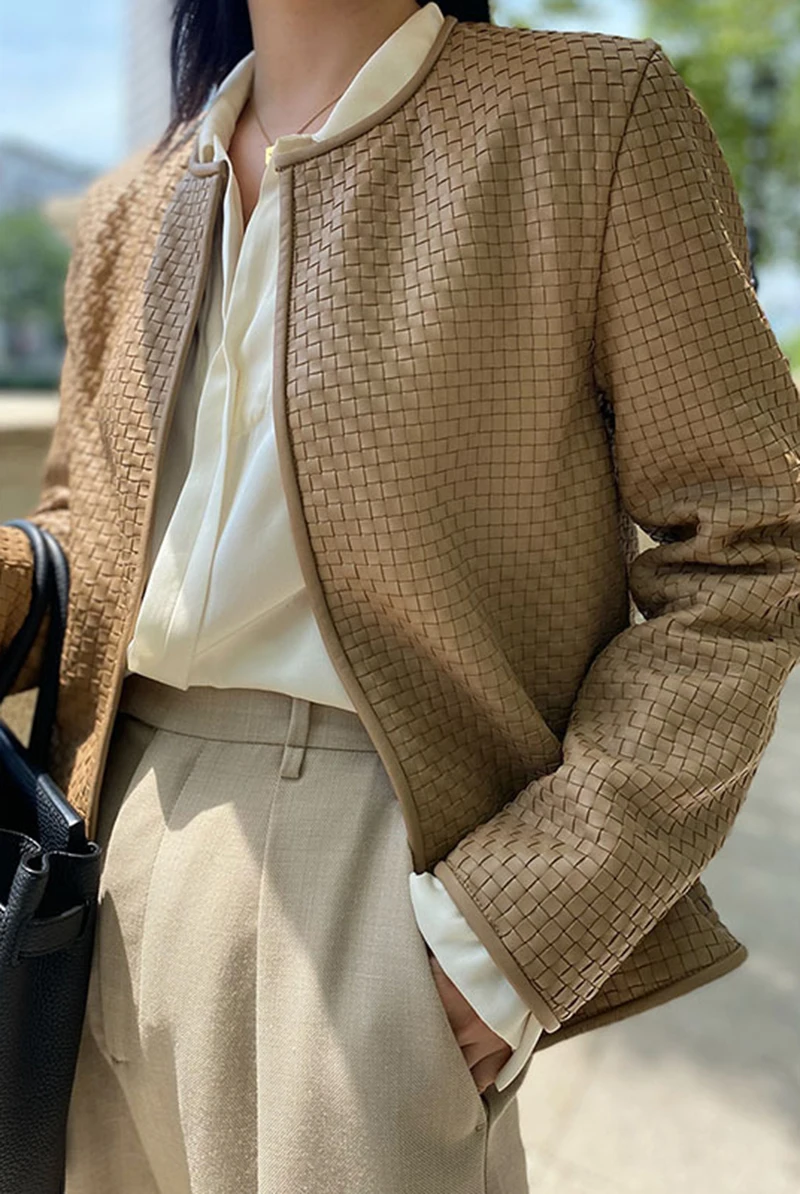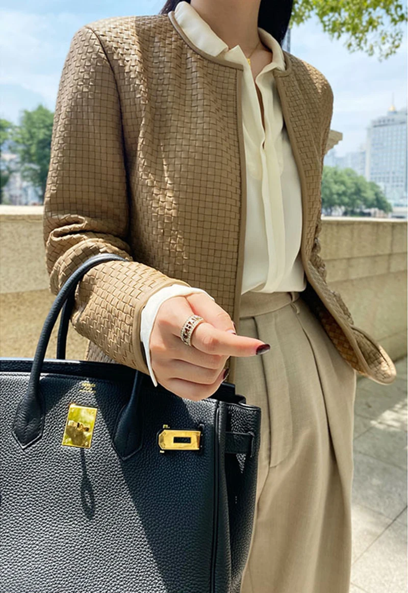 Genuine Leather Jacket/Women Stylish Vintage Jacket/Hand-Woven Sheepskin/O-Neck Cardigan Plaid Coat Outwear.