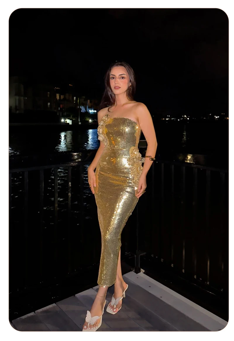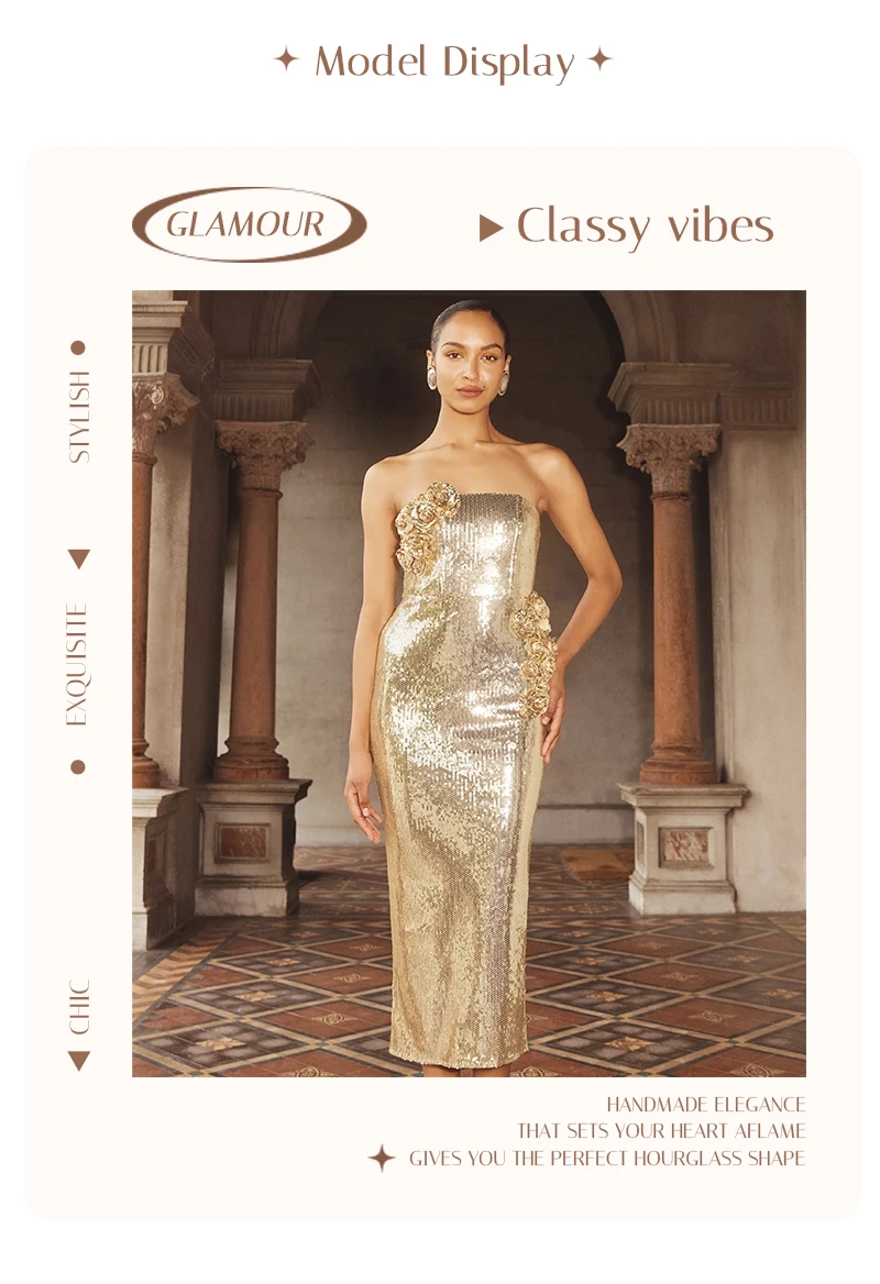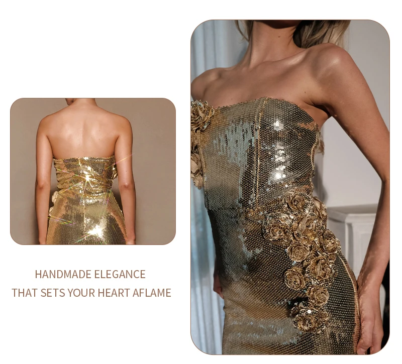 This strapless gown is a vision of opulence. Crafted from shimmering gold sequins, it hugs the body to create a flattering mermaid silhouette. The floral embellishments add a touch of romance and texture. Ideal for glamorous events like award shows or high - end parties, it combines sparkle and elegance for a show - stopping look.