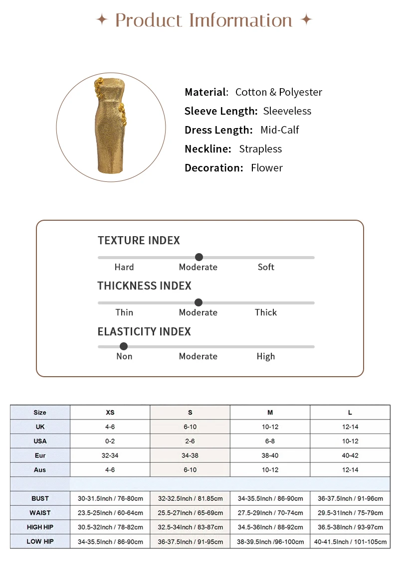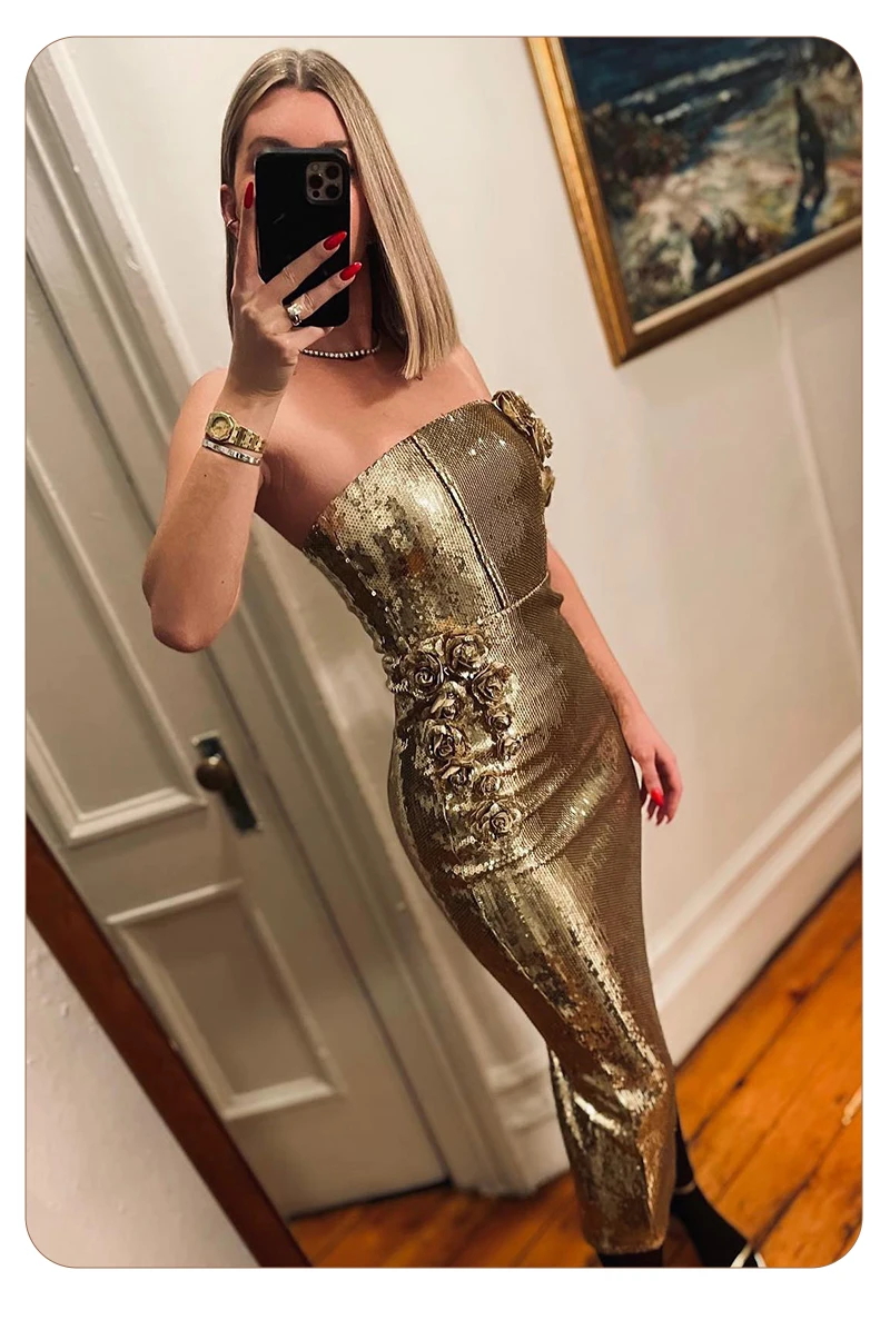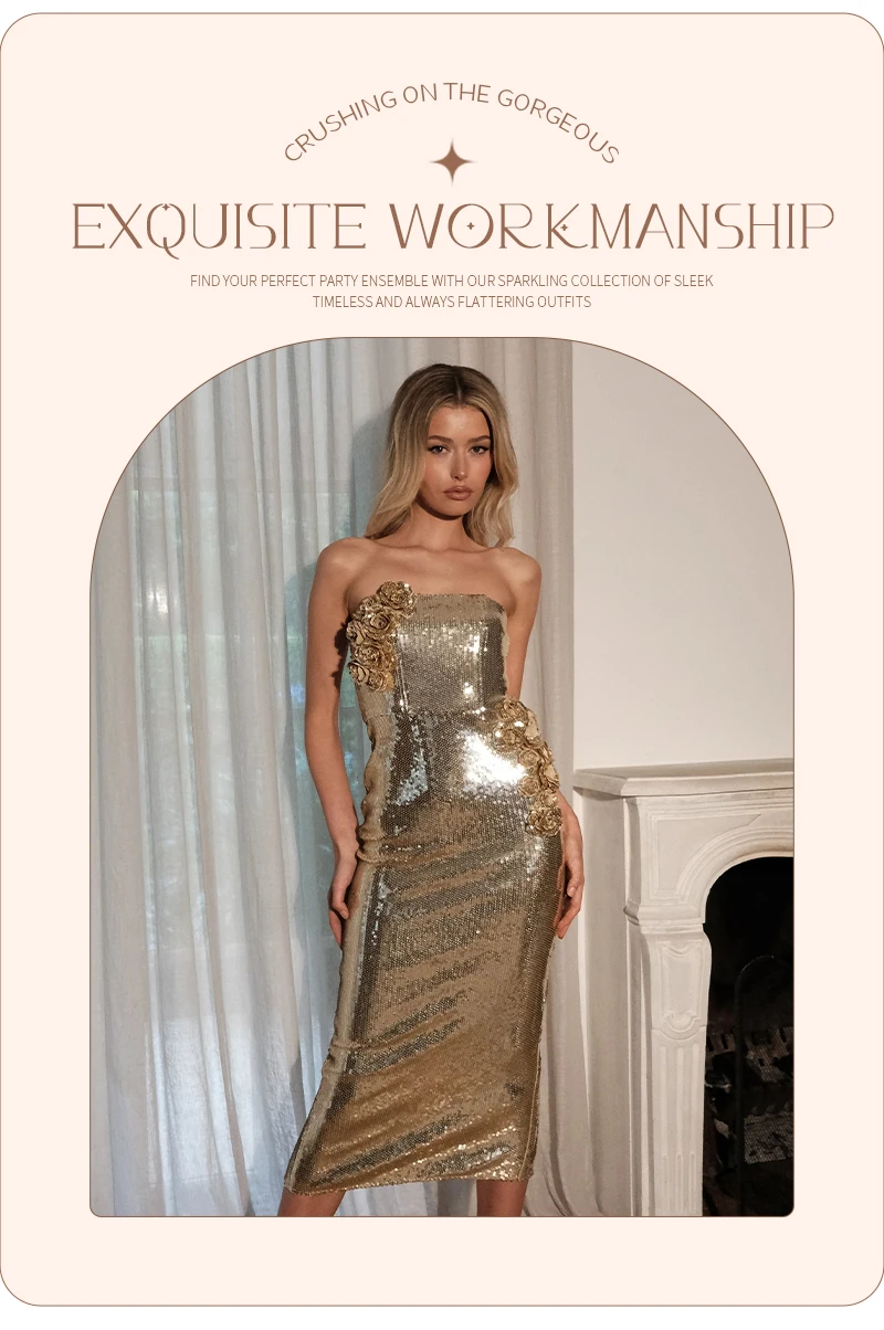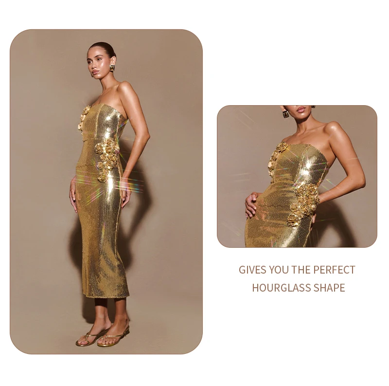 Sexy Golden Off Shoulder Sequin Dress/Long Strapless Floral Embellishment/Sleeveless Slim High Waist Cocktail Event’s.