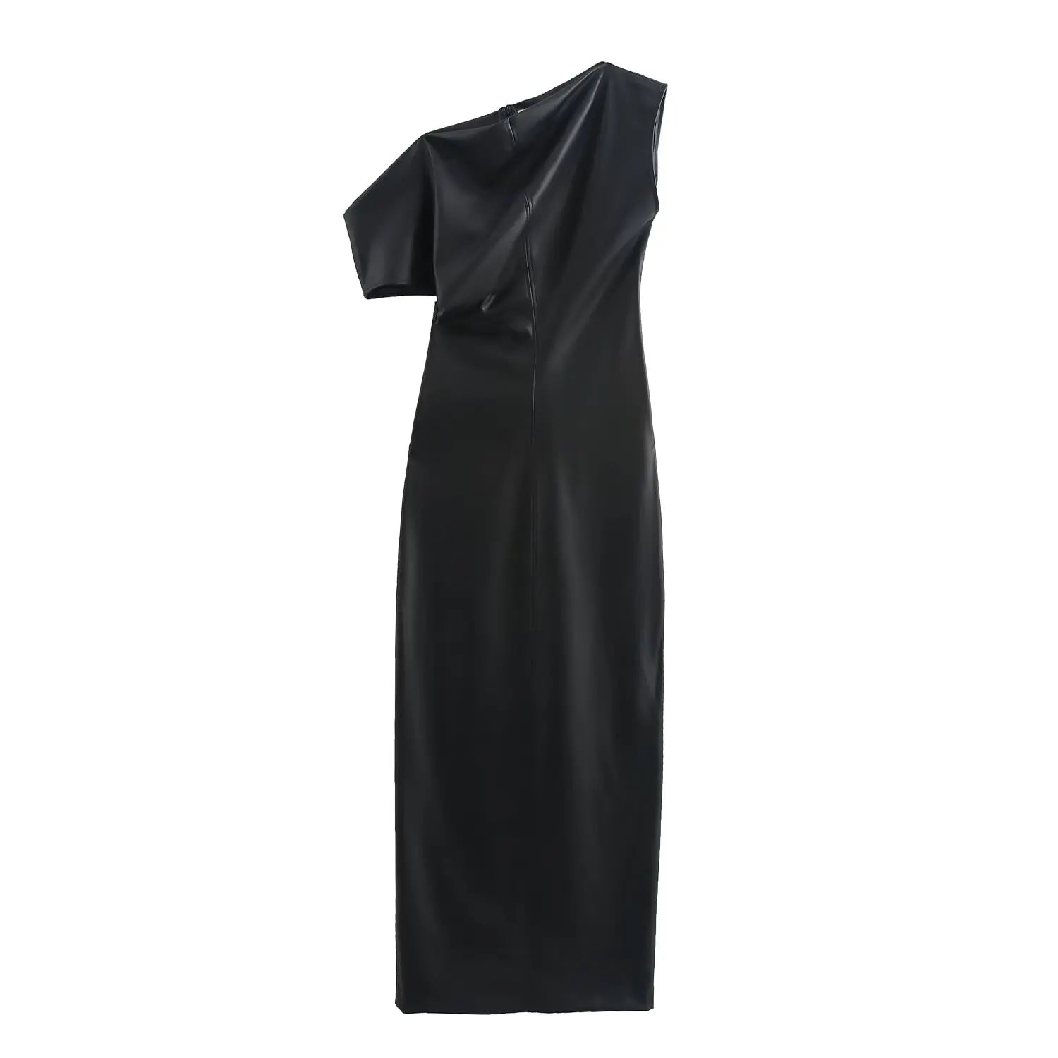 Black Leather Sleeveless Dress/Back Zipper Midi Asymmetrical Slit Hem Folds/Slim Party Dress/All Occasions.