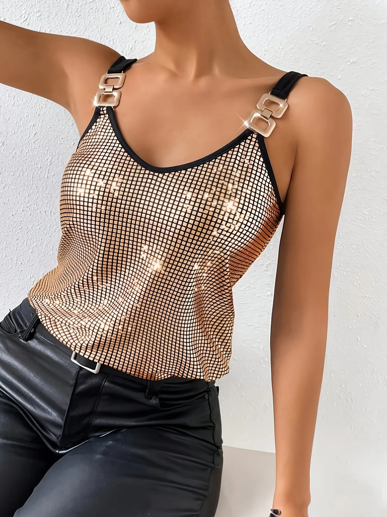 This sequin top adopts seAdjustable elastic strap Adjustable Straps Design