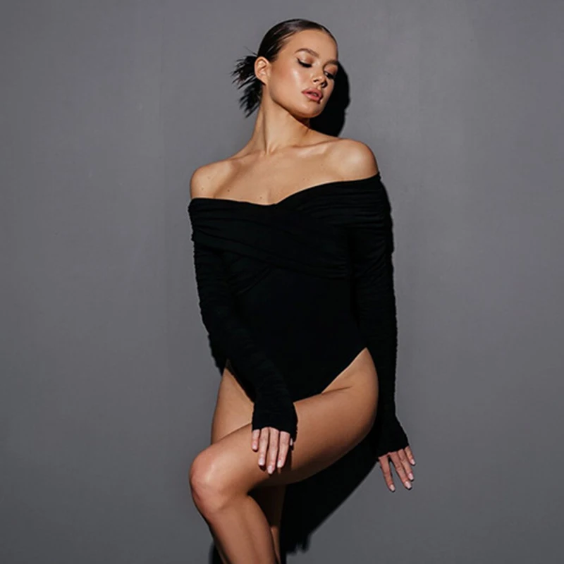 Unique One Shoulder V-Neck Blouse/Pleated Long Sleeved Fitting Temperament Style.